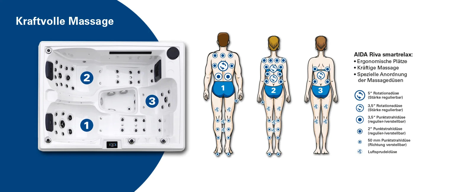 Der AIDA Riva smartrelax besitzt 55 Massagedüsen in verschiedenen Größen und mit verschiedenen Funktionen. Ein abwechslungsreicher Mix an Punktstrahldüsen, Rotationsdüsen und Luftsprudeldüsen verspricht Wellness pur. Bestimmen Sie selbst das Düsenbild, denn im Rückenbereich sind Düsen gleicher Größe (auch bei unterschiedlicher Funktion) untereinander austauschbar.