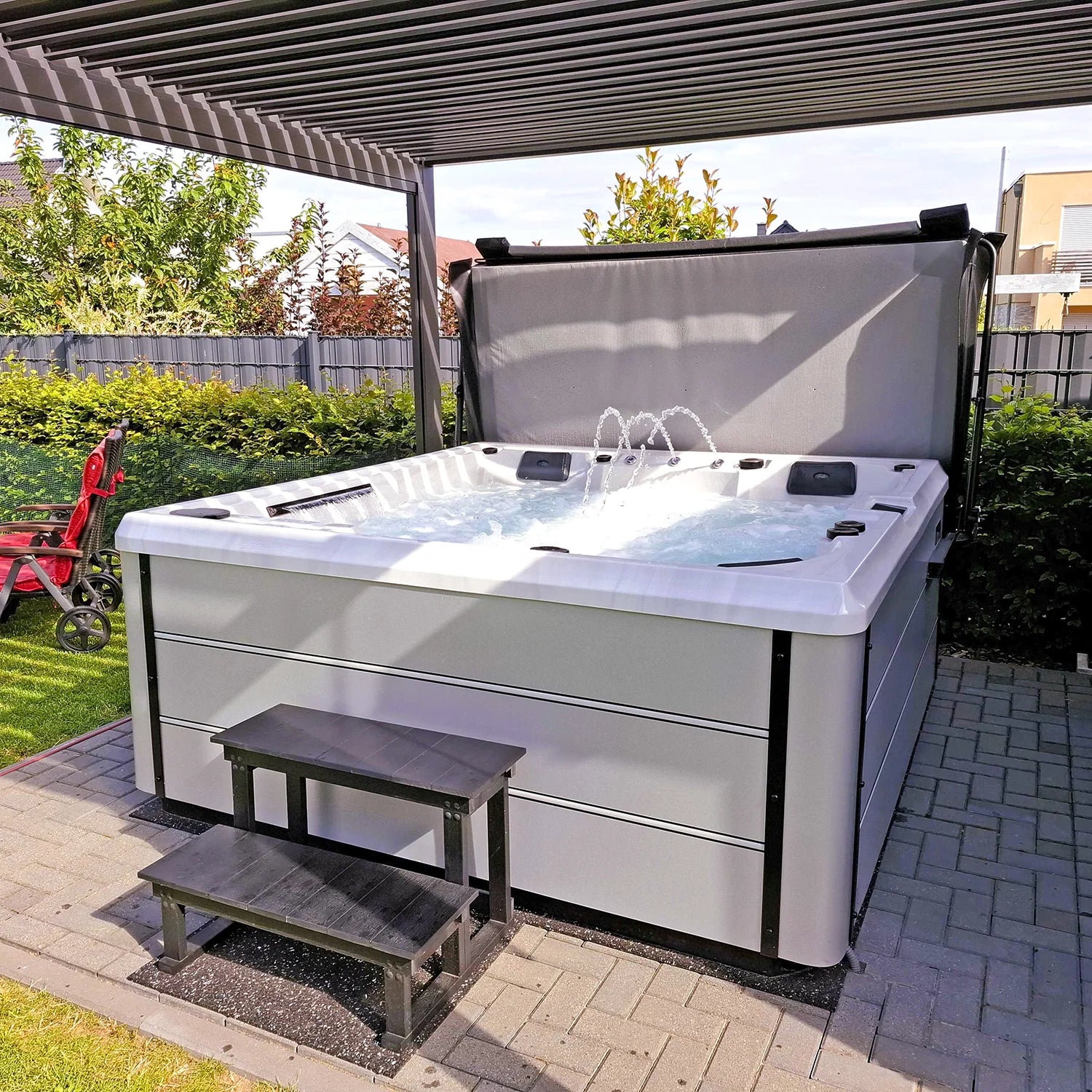 Beleuchtete Fontänen gehören ebenfalls zu den Highlights dieses Whirlpools, wie ein 60 cm breiter Wasserfall. Er lässt sich über die Zirkulationspumpe gesondert einschalten. Das bedeutet, dass keine Wasserpumpe für den Betrieb des Wasserfalls notwendig ist. Daher ist ein nahezu geräuschloses Betreiben des Wasserfalls möglich. Das beruhigende Plätschern schafft ein besonders schönes Ambiente im Garten, zum Beispiel bei Ihrem nächsten Grillfest.