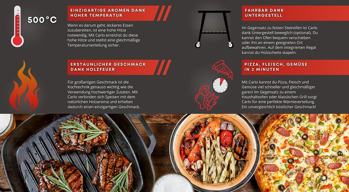 Willkommen in der faszinierenden Welt des Steinofens Firewolf Carlo! Sei es in der Ruhe Ihres eigenen Gartens oder auf Ihrer gemütlichen Terrasse: In diesem Outdoor Ofen können Sie unzählige Köstlichkeiten zubereiten – von der perfekt knusprigen Pizza bis hin zu saftigem Fleisch, feinem Gebäck und knackigem Gemüse. Dank seiner großzügigen Backfläche ist dieser Steinbackofen ideal für gesellige Runden mit vielen Gästen.