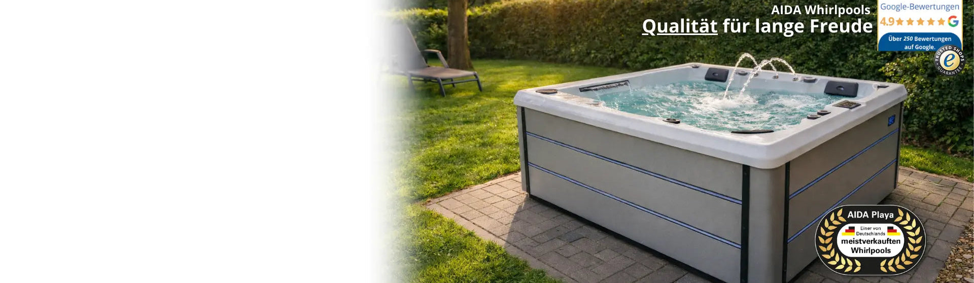 AIDA Whirlpools legt besonderen Wert auf eine hohe Kundenzufriedenheit. Damit Sie AIDA Whirlpools vertrauen können, haben wir uns bereits 2017 nach den Trusted Shops Qualitätskriterien zertifizieren lassen. Seitdem haben wir dadurch mehr als 1700 verifizierte Bewertungen für Bestellungen über unseren Onlineshop erhalten. Der Anteil an 5-Sterne-Bewertungen liegt bei über 90% (Stand Dez. 2024). Siehe Trusted Shops: Gütesiegel für AIDA Whirlpools. Bei den Google-Unternehmensbewertungen liegt AIDA Whirlpools mit über 240 Bewertungen bei 4,9 von 5 Sternen (Stand Dez. 2024).